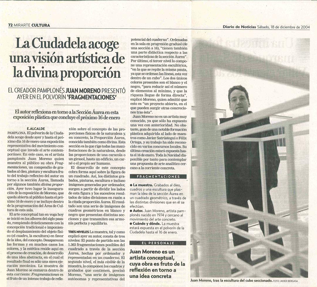 Cada artista penetra en el mundo con las armas que le son propias. Juan Moreno se sirve de la coherencia como instrumento de indagación en su proceso creativo. Y no es casual que su recurso principal sea la Sección Áurea o Divina Proporción. Armonía como respuesta al caos. Y hablo de coherencia porque, alejado de cualquier artificio o canto de sirena, Juan lleva profundizando más de diez años en el potencial plástico y las múltiples versiones del proyecto Fragmentaciones.