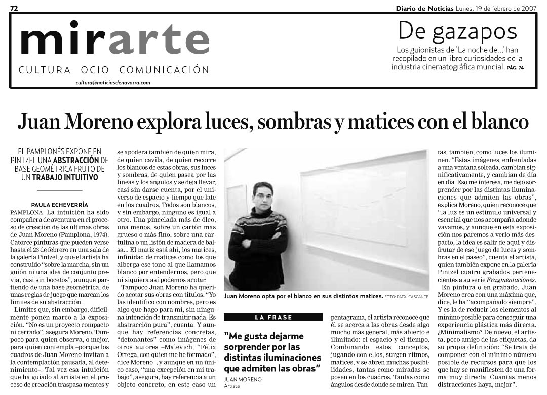 Junto a la exposición “Calignometrías” de Koldo Sebastián expone Juan Moreno (1974), artista joven de trayectoria breve pero coherente. Fruto de la casualidad o de una feliz sincronía, el hecho es que la coincidencia de dos generaciones de artistas geométricos de Iruñea en la misma galería -tan afines en su estética genérica como diferentes en sus vías experimentales- demuestran la continuidad y la vigencia de cierta visión del arte que tuvo su momento de esplendor vanguardista y que, tras la escolástica minimalista, pareció declinar definitivamente.